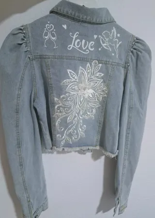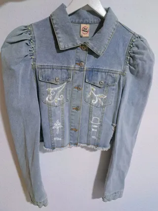 Cazadora vaquera exclusiva de la marca Soy Mala. Un diseño único con detalles bordados. - Mangas abullonadas. - Bordados florales y de accesorios. - Corte cropped con deshilachado. - Cierre de botones metálicos. - Si es para Boda se la enviamos con el nombre de los Novios donde mas les guste. (Por el mismo precio)