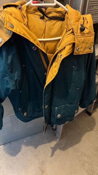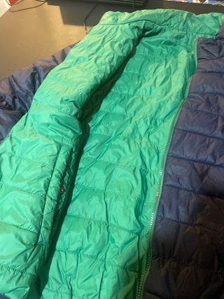 Chaqueta ligera reversible con un lado azul y otro verde. - Cierre de cremallera. - Bolsillos laterales con cremallera. Es unisex. Talla S (38) mujer y talla S para niño de 12/14 años. Ancho 50cm Largo 65cm Mangas: 63cm