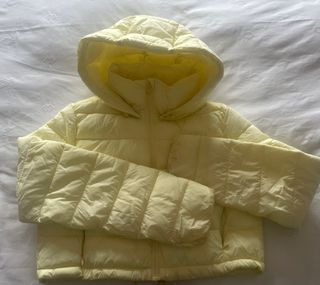 Chaqueta de plumas corta para niña/adolescente. - Diseño acolchado. - Amarillo suave. - Capucha integrada. - Cierre de cremallera frontal. - Dos bolsillos.