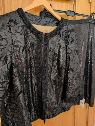 Elegante conjunto de chaqueta y falda con lentejuelas.Comprado en El Corte Inglés, costó 150 €.Es muy bonito.La chaqueta es de lentejuelas con dibujo floral y rematada con rosas de raso y una cuenta central, la falda es de la misma tela pero de lentejuelas lisas.Forro de raso beige/dorado. - Chaqueta con detalles florales y adornos. - Falda a juego con acabado brillante.