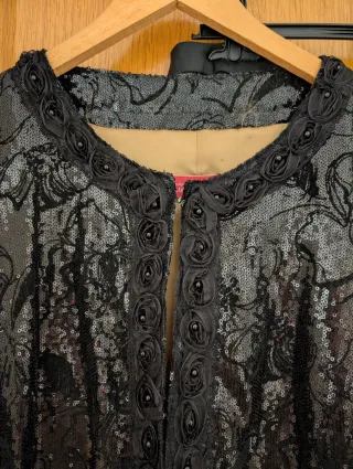 Chaqueta corta de la colección de Cristina Garcia Son Rosas de gasa sobre un tejido de tul y pequeñas lentejuelas en negro Con lazo de raso para atar Manga corta Está en perfecto estado nunca se ha usado la compré para un vestido de tirantes y no la necesité Sirve para tallas en entre la 50 y 54