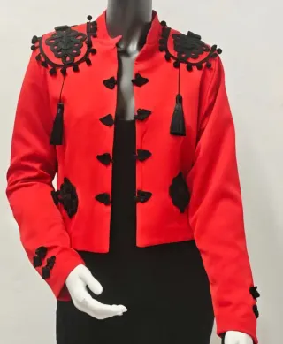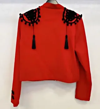Chaqueta de estilo torera flamenca en color rojo. Presenta detalles decorativos en negro. - Diseño corto y entallado. - Adornos florales y borlas negras. - Cierre con botones negros. - Mangas largas. Nuevo con etiqueta Disponible más colores y tallas