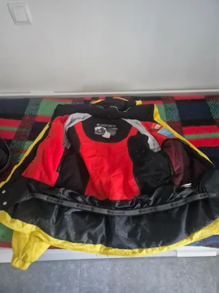 Chaqueta de esquí con un diseño deportivo y llamativo. - Combinación de colores rojo y negro. - Cuello alto para mayor protección. - Cierre frontal con cremallera y botones. - Bolsillos laterales con cremallera. Tiene el nombre escrito en rotulador, muy poco uso. Aunque la talla ponga 42, vale para 40-42