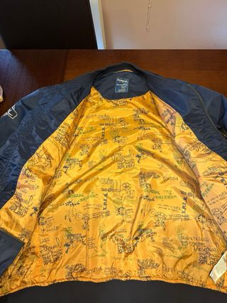 Chaqueta cazadora de la marca Desigual con un diseño moderno y llamativo. - Estampado interior con texto y motivos gráficos. - Cuello alto con detalle de tejido diferente. - Cierre de cremallera frontal. - Bolsillos laterales.