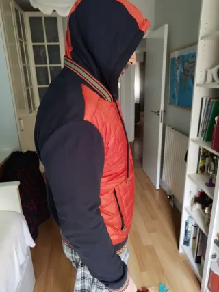 Cazadora Desigual con un diseño moderno y llamativo. - Cuerpo acolchado en color naranja. - Mangas y capucha en color azul marino. - Cierre de botones a presión. - Puños y bajo con banda elástica.