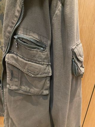 Cazadora estilo militar de la marca Desigual. - Color verde militar. - Diseño con múltiples bolsillos. - Capucha integrada. - Cierre de cremallera.