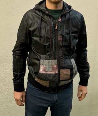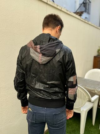 Chaqueta de la marca **Desigual** con el estilo característico de la firma: diseño único, mezcla de tejidos y detalles creativos. Es una cazadora ligera en color negro con capucha y cierre de cremallera frontal. Destaca el bolsillo tipo canguro con parches de distintos estampados (cuadros, rayas y tonos tierra), dando un toque original y urbano. Los puños y el bajo son elásticos para mejor ajuste. Ideal para un look casual con personalidad.