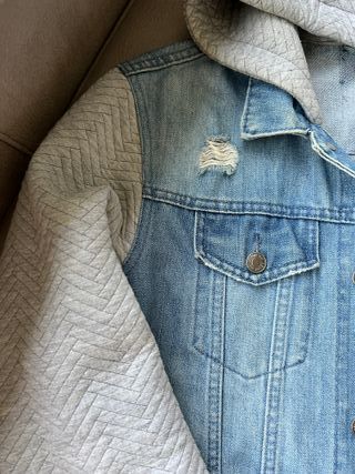 Chaqueta vaquera de la marca Desigual con mangas y capucha de tela gris. - Diseño moderno y juvenil. - Cierre de botones. - Bolsillos frontales con solapa. - Puños y bajo de tela elástica.