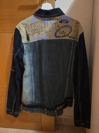 Chaqueta de marca Desigual con un diseño juvenil. De tela vaquera, con muchos bolsillos. Costó más de 100€, está en buen estado y recién limpiada. Tiene capucha que se puede poner y quitar. - Cierre de cremallera y botones. - Bolsillos frontales con solapa. - Cuello alto. - Forro interior estampado. - Capucha opcional Más chaquetas en mi perfil 🧥
