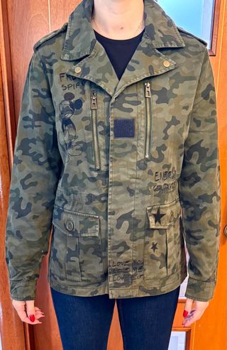 Chaqueta con estampado de camuflaje y diseño de Mickey Mouse. - Cierre de cremallera. - Bolsillos frontales con botón. - Detalles de parches y texto.