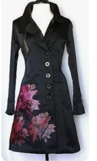 Elegante chaqueta larga con un diseño floral llamativo en la parte inferiordd tonalidades rosadas de la marca DESIGUAL. - Cierre de botones. - Cuello solapa. - Detalle de flores en tonos rosas y morados. - Gabardina - Abrigo Largo - Chaqueta