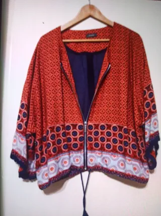 Chaqueta estilo kimono con un diseño vibrante y colorido. Es una prenda versátil que añade un toque especial a cualquier atuendo. - Diseño de estampado étnico. - Manga tres cuartos. - Corte abierto tipo kimono. - Talla S. Bershka - Usado únicamente en un par de ocasiones