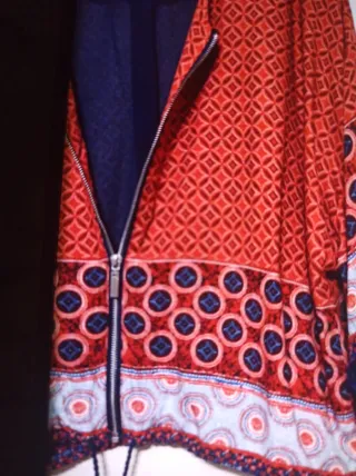 Chaqueta polar con un diseño llamativo y moderno. Perfecta para añadir un toque de color a tu estilo. Lo vendo porque me queda grande. - Tejido polar suave y cálido. - Mangas con estampado étnico. - Cierre de cremallera frontal. - Bolsillos laterales.