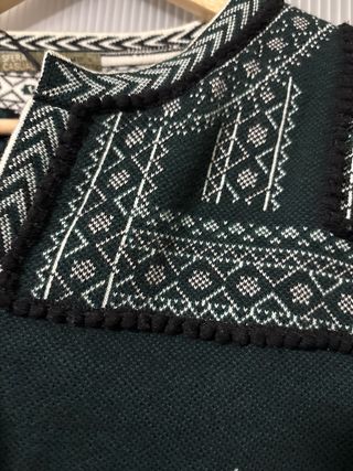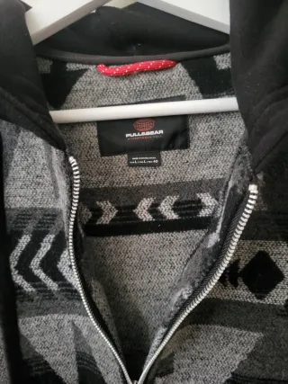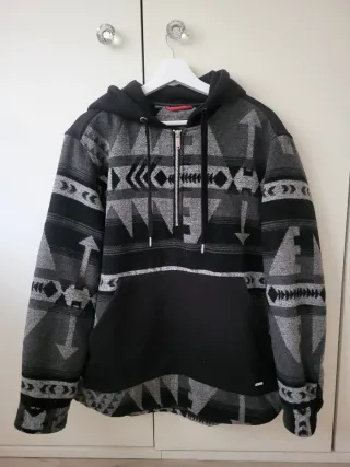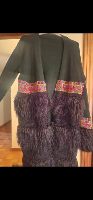 Vendo chaqueta hombre de lana con un diseño étnico y llamativo. Ideal para añadir un toque de estilo a tu vestuario. - Estampado étnico con llamas. - Cierre con botones madera. - Con bolsillos y cordón ajustable. - Muy calentita y muy cómoda. - Talla XL.