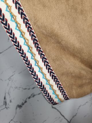 Chaqueta boho de corte abierto con un bonito efecto ante en color camel. Presenta un diseño étnico con ribetes bordados en las mangas. Marca Mulaya, talla M mujer, medidas abajo. Es una chaqueta abierta sin botones, estilo kimono fluido, con detalles en azul, morado, rosa y blanco. Mangas 3/4. Tacto muy suave. Esta chaqueta - cárdigan es ideal para un look casual bohemio o alternativo. -📐68 cm largo, 40 cm hombros, 50 cm cuello-manga. donna giacca tipo pelle marrone marrón brown chic
