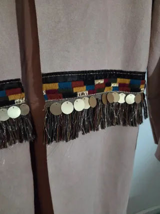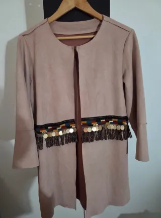 Preciosa chaqueta de ante con detalles étnicos. - Diseño abierto. - Adorno de flecos y monedas en los bajos. - Mangas acampanadas. Apenas usada