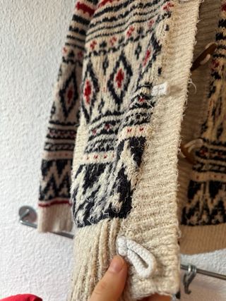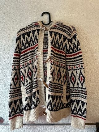 Chaqueta de punto con un diseño étnico y cierre de botones de madera. - Estampado geométrico en tonos beige, negro y rojo. - Cuello con capucha. - Puños y bajo de canalé. pone s aunque realmente puede valer a una persona m