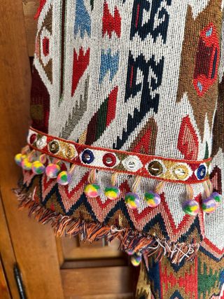 Abrigo con dibujos étnicos y contorno con flecos. Bolsillos laterales. Está en perfecto estado. Cómo nuevo. Marca Zara. Talla S. Es bastante amplio , también valdría para una M. Abriga bastante.