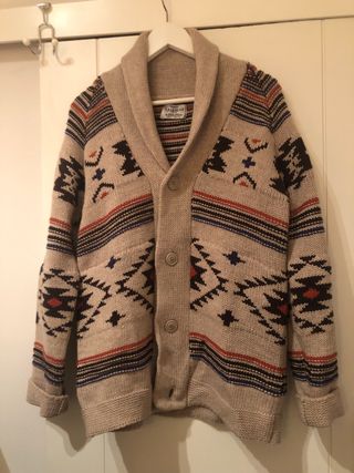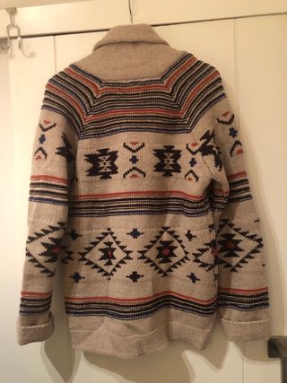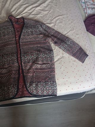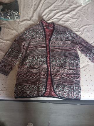 Es abierta y de punto fino. Mangas francesas un poco anchas. Dibujo étnico multicolor. Guardada sin haberse usado nunca. Talla M, pero da talla. Ver 6 fotos. Zona Velázquez-Juan Bravo.