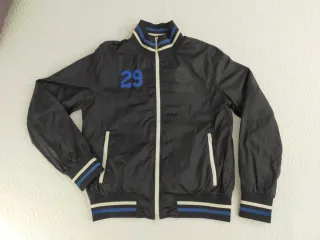 Chaqueta bomber Franklin & Marshall, talla M, en color gris. Está en buen estado. - Diseño deportivo con detalles en azul marino y blanco. - Cierre de cremallera. - Bolsillos laterales con cremallera. - Número 29 estampado en la parte delantera y trasera.