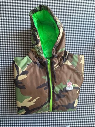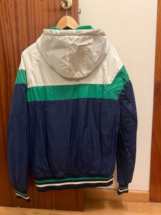 Cazadora reversible de la marca Franklin & Marshall. Se ha usado muy muy poco. Presenta un diseño elegante y juvenil. - Mangas de color blanco. - Cuerpo principal en color verde. - Capucha con cordones. - Puños y cintura con rayas. La otra cara es de color gris con los detalles en de las letras y demás en verde.