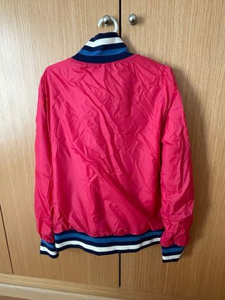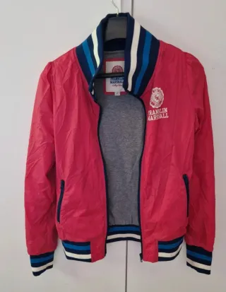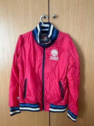 Preciosa chaqueta roja de Franklin Marshall. Está en muy buen estado y tiene un diseño deportivo muy chulo. - Tiene capucha. - Cremallera frontal. - Puños de canalé con rayas rojas y crema.