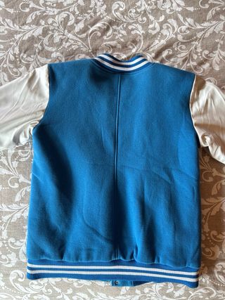 Chaqueta estilo universitario con el nombre Franklin bordado en la espalda. - Cuello, puños y cintura con detalles de rayas. - Cierre de botones a presión. - Bolsillos laterales. Pone talla XL pero da menos talla