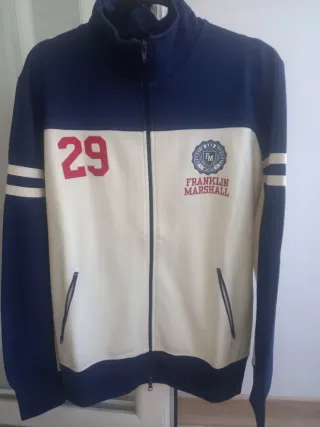 Chaqueta cremallera de Franklin Marshall con un diseño bicolor. Original 70cm largo 55cm ancho - Número 29 en rojo en la parte frontal y espalda. - Logo de Franklin Marshall en el pecho. - Puños y cintura elásticos. Más ropa original de marca en mi perfil