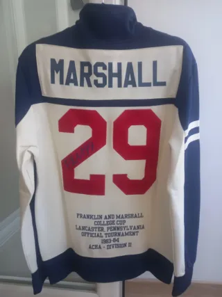 Chaqueta deportiva con el nombre MARSHALL y el número 29 en grande. Incluye detalles bordados. - Nombre: MARSHALL - Número: 29 - Inscripción: F&M99 - Detalles: FRANKLIN & MARSHALL FOOTLL CUP BEAVETADIUM OFFICIALURNAMENT 1-84 ACHA VISION II