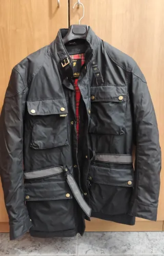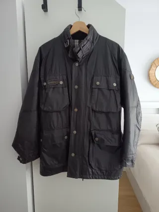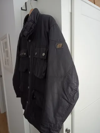 VENDO, O CAMBIO POR UNA TALLA S. Chaqueta de motorista, estilo Barbour, de la marca Garibaldi (talla 50) ideal para los amantes de las motos y la moda retro. Muy cuidado. Algodón encerado (regalo 1/2 lata de cera, marca Barbour). Cremallera en perfecto estado. Cinturón original. Forro interior térmico (tipo thinsulate y "aluminio"). Vendo, o cambio por una talla S, en similares condiciones. Desgastes propios de un uso moderado (ver fotografías), fácilmente reparables. - Diseño clásico con múltiples bolsillos.