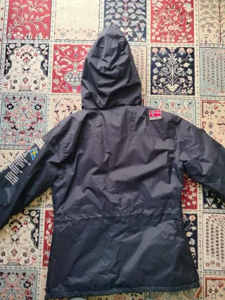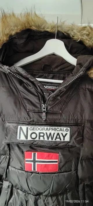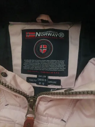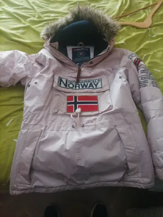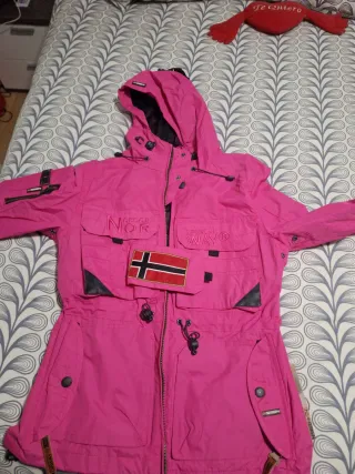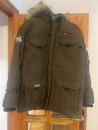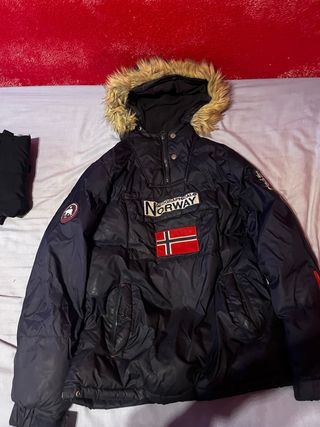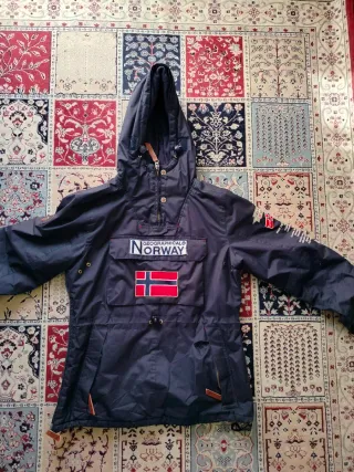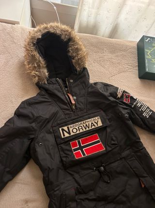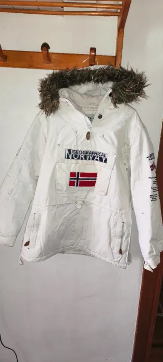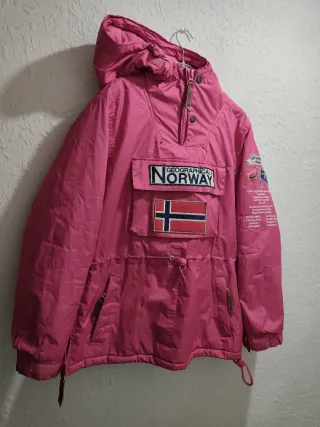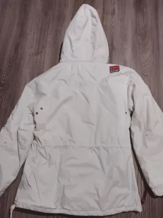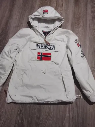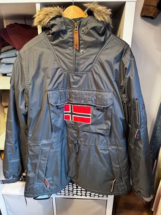 Chaqueta anorak Geographical Norway en talla M. Ideal para el frío y la aventura. - Diseño con capucha y pelo. - Bolsillo frontal grande. - Detalles de la bandera de Noruega. - Parches distintivos en mangas y pecho.