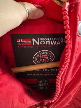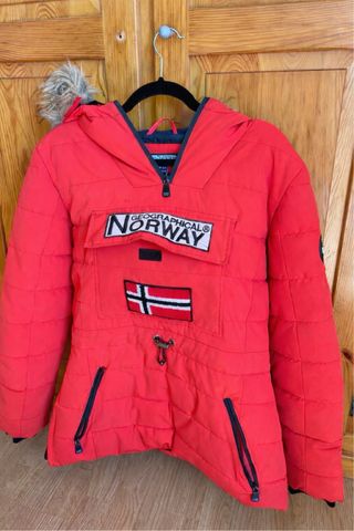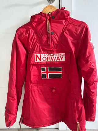 Chaqueta Geographical Norway de color rojo. Perfecta para esquiar/hacer snow o simplemente para el frio. Muy poco usada, muy bien cuidada y en buen estado - Diseño con capucha. - Cierre de cremallera frontal. - Bolsillo canguro. - Parche con la bandera de Noruega. - Cordón ajustable en la cintura.