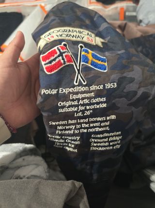 Chaqueta Geographical Norway en color negro, con capucha y detalles distintivos. - Diseño con parche frontal GEOGRAPHICAL NORWAY. - Bandera de Noruega bordada en el pecho. - Parche lateral con banderas de Noruega y Suecia. - Texto Polar Expedition since 1953 y otros detalles. - Capucha con borde de pelo sintético.