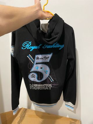 Chaqueta Geographical Norway en color negro y talla L. Diseño con capucha y detalles de la marca. - Cierre de cremallera frontal. - Bolsillo canguro en la parte delantera. - Parche con la bandera de Noruega en el pecho. - Insignia de Geographical Norway en la manga.