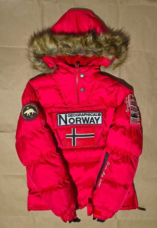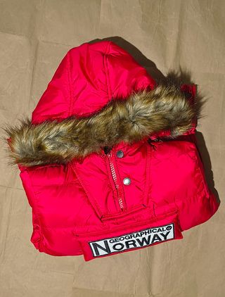 Chaqueta Geographical Norway Original en color rojo intenso 🔥 Estado como nueva, usada solo una vez. Muy cálida y cómoda, perfecta para el invierno. Capucha con pelo sintético desmontable, bolsillo frontal con logo bordado y bandera de Noruega, cierre con cremallera y ajuste en la cintura para mejor comodidad. Talla XXL. Sin manchas, sin daños, en perfecto estado. Ideal para el frío ❄️ ¡Lista para usar! Envío rápido 📦🚄