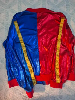 Chaqueta inspirada en Harley Quinn, con un diseño llamativo y moderno. - Diseño dividido en rojo y azul. - Detalles dorados en mangas y puños. - Cremallera frontal.