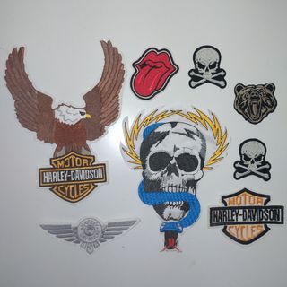 Parches harley-davidson para coser en un chaleco o chaqueta. Menos la calavera grande todos tiene cola para fijarlos o prefijarlos si luego los coses. Moto, motero, ruta, crew, clan, chopper, carretera, autovia, club, clubes