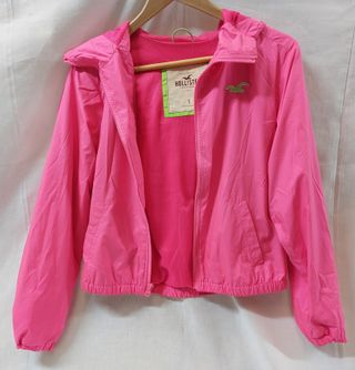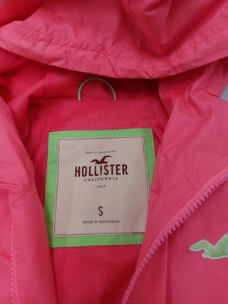 Chaqueta Cortavientos muy fina de Hollister, talla S en rosa neón. Medidas: largo 52 cm, sisa 46 cm y manga 58 cm. Con capucha, cierre con cremallera. Impecable