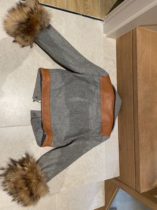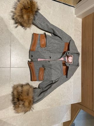 Cazadora de la marca Holy Preppy con un diseño único y llamativo. - Combinación de texturas y colores. - Detalle de pelo en capucha y puños. - Cierre con cremallera y botones. - Bolsillos frontales con cremallera. Usada una unica vez