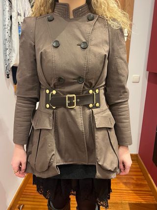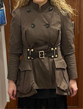 Nunca usada. Siempre me ha quedado pequeña 😂. Azul oscuro casi negro (asumo que es azul porque tiene el hilo azul, pero es muy muy oscuro) Talla XS: Hay que tener en cuenta que está marca se lleva bastante ajustada, así que supongo que indicar que "talla pequeña" es correcto. - Diseño con cinturón para ajustar a la cintura. - Cuello con solapas. - Cierre de botones. - Puños con detalle de hebilla.