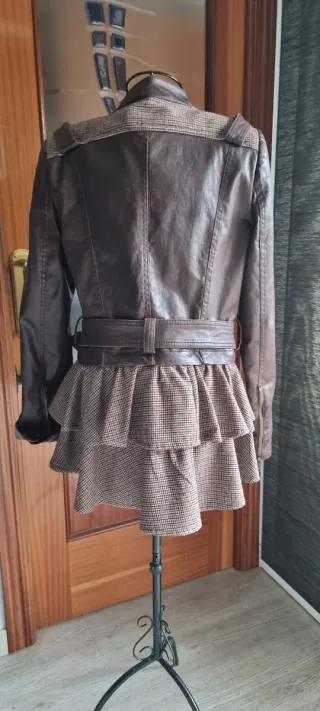 Chaqueta estilo biker con un diseño único y detalles de volantes. - Combinación de piel encerada marrón y tejido de cuadros. - Cinturón a juego para ajustar la silueta. - Detalle de volantes en la parte inferior con cremallera para poder quitarlo