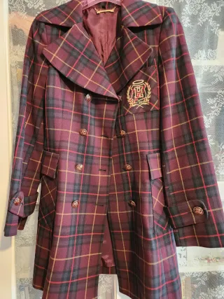 Elegante levita de cuadros con un diseño clásico y distintivo. - Estampado de cuadros en tonos burdeos, negro y dorado. - Doble abotonadura frontal. - Bolsillos de solapa. - Detalle de escudo bordado en el pecho.
