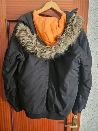 Chaqueta de invierno con capucha y detalles de pelo sintético. - Cierre de botones y cremallera. - Bolsillos frontales. - Parche con logo en la manga.