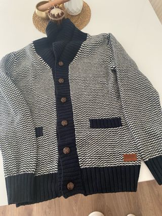 Chaqueta de punto con diseño de espiga en blanco y negro. - Cuello alto - Cierre de botones - Bolsillos delanteros - Detalle de etiqueta de la marca