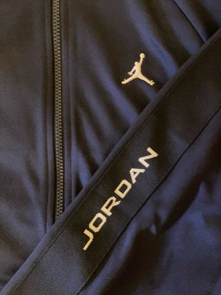 Chaqueta deportiva Jordan de color azul marino. Está sin estrenar con la etiqueta original. Era un regalo para mi hijo pero no le iba bien y no se podía devolver. - Cierre completo con cremallera. - Logo de Jordan bordado en el pecho. - Banda con el logo de Jordan en las mangas. - 2 bolsillos Material: poliester