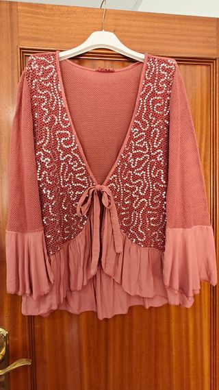 Chaqueta punto salmón lentejuelas y mangas bolero