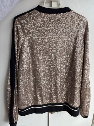 Chaqueta bomber con detalle de lentejuelas doradas. De color negro mangas y parte trasera. Nueva sin uso alguno - Diseño de entretiempo. - Cierre de cremallera frontal. - Mangas largas.