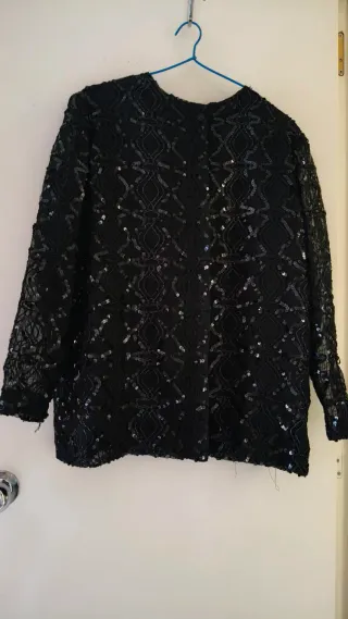 Elegante chaqueta corta negra, perfecta para ocasiones especiales. Presenta un diseño adornado con lentejuelas. Es ideal para estás fiestas es corta y sienta muy bien talla S .Su precio 10€. - Adorno de lentejuelas en cuello y bajo. - Corte moderno y favorecedor.