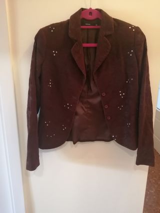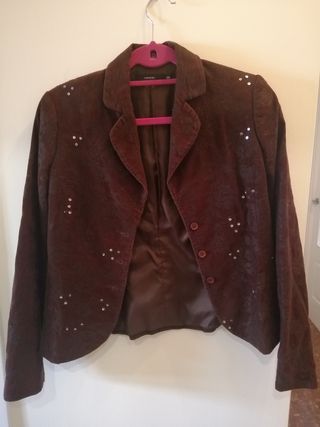 Chaqueta marrón oscuro de pana finita bordada la tela con hilo del mismo color. Tiene unos adornos de lentejuelas, muy discretos, solo en delantero. De solapa, cierra con tres botones. Está completamente forrada. Es de cortefiel, talla 38. En perfecto estado. Hago envíos o entrego en mano.