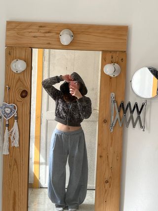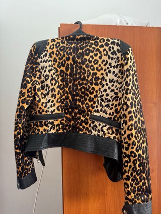 .Esta chaqueta corta tipo crop con un llamativo estampado de leopardo en tonos marrones y negros. Se caracteriza por un diseño ligero, cierre de cremallera frontal y acabados elásticos en los puños y la cintura. Pone talla S pero es una xs está en perfectas condiciones